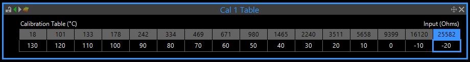 Non-linear temperature sensor data is entered into Cal Table 1. The information should be entered in the following way.