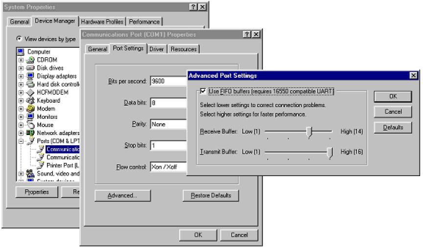 The exact procedure to do this will depend on the version of Windows installed and the type of serial port drivers used. Below is a couple of examples of disabling the FIFO buffers.